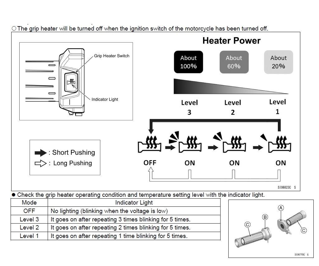 There is an automatic battery saver function. If the battery voltage drops while using the grip heater, the grip heater turns off and the indicator light blinks.