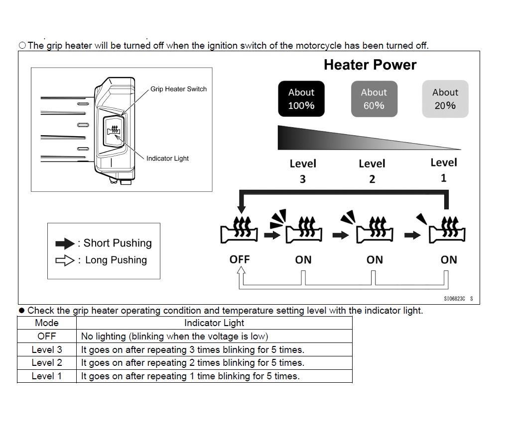 There is an automatic battery saver function. If the battery voltage drops while using the grip heater, the grip heater turns off and the indicator light blinks.
