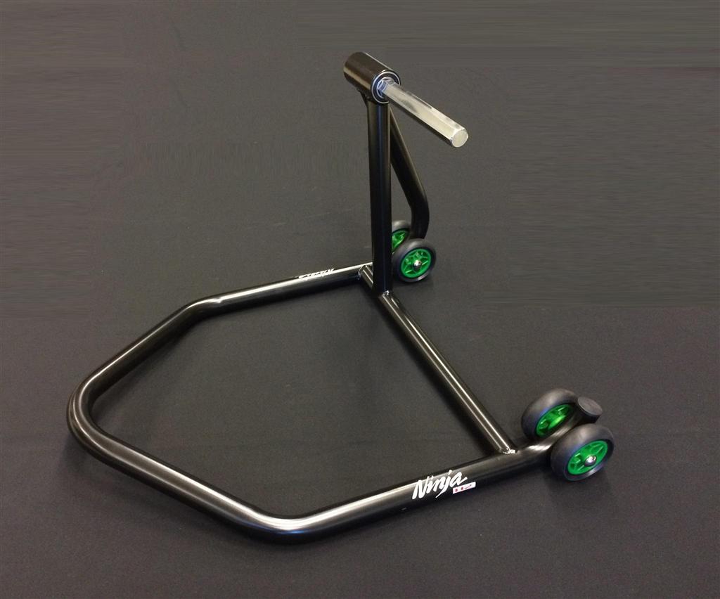 Special single-sided rear swingarm stand made specially for the Ninja H2. Extra wide for easier fitment and higher to enable room for tire warmers. Strong 35mm diameter steel tubing with black powder coating. Wheels are colored nylon with a soft rubber tyre. (L70 x W63 x H43 cm) Weight 5,8kg.