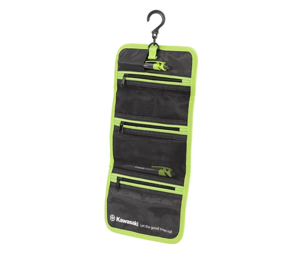 Roll-up toiletry bag with hook and three zipped compartments.